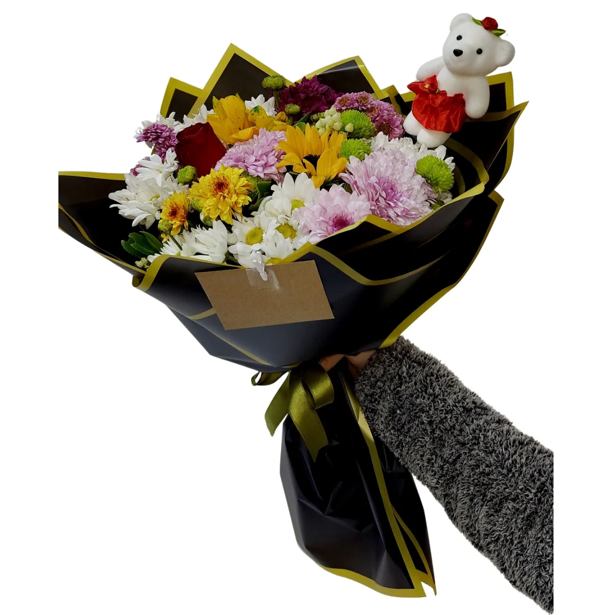 Gökkuşağı Neşesi: Ayıcıklı Renkli Kasımpatı Buketi Tasarım 'da kullanılan çiçek ve aksesuarlar stok durumuna göre farklılık gösterilebilir.